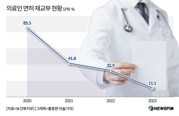 보건복지부에 따르면 의료인 면허 재교부 비율은 2020년 85.5%에서 2023년 11.1%로 하락했습니다.
